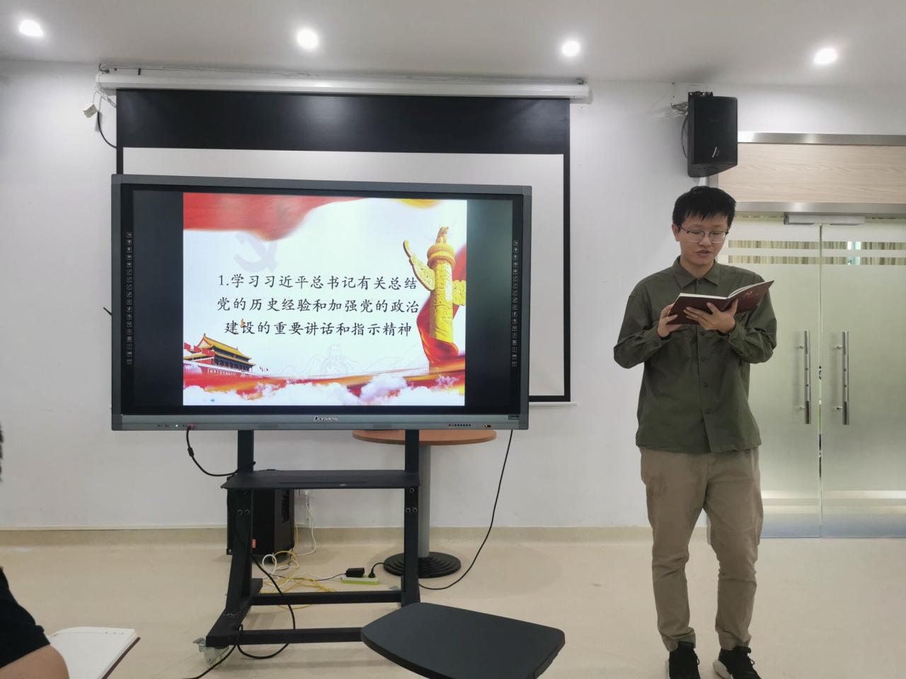 会议第一项,学习习近平总书记系列重要讲话精神。首先由曾昊同志带领同志们学习习近平总书记有关总结党的历史经验和加强党的政治建设的重要讲话和指示精神相关内容。