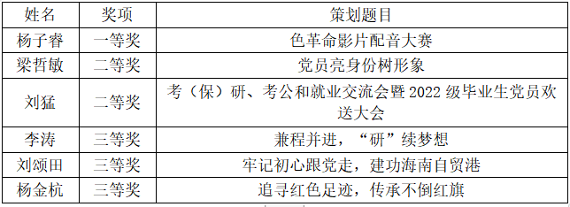 本次大赛的评委由永利集团88304官网党委副书记黄小欧老师和各支部书记、副书记等9名同志组成,采用匿名方式对参赛的策划进行了评定,最终结果如下: