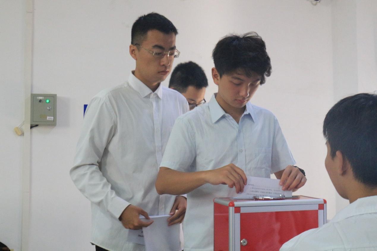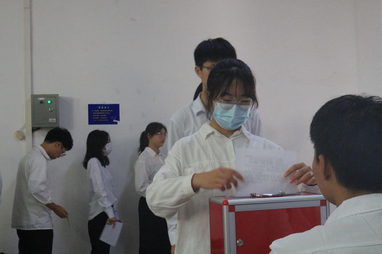 大会第六项,永利集团88304官网各班优秀团员代表认真填写选票,并在监票人的监督下将选票有序投入选票箱中。