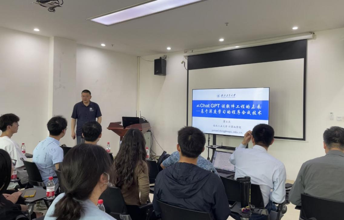 董云卫教授的报告题目是“从Chat GPT 谈软件工程的未来——基于深度学习的程序合成技术”。主要介绍了以Chat GPT为代表的生成式神经元网络技术的快速发展和逐步成熟应用,对软件工程理论和技术的发展迎来巨大的机遇和前所未有的挑战。传统的软件开发技术将被替代,软件工程师的能力培养和工作角色也将发生巨大变革,基于深度学习的程序合成技术就是在这样的背景下发展起来的,它利用深度学习技术自动生成满足用户意图的目标程序。董教授的报告从Chat GPT的发展开始,介绍了生成神经元网络模型在软件开发过程中户意图理解、程序理解、模型训练、模型测试等角度的技术发展成果,总结了每一类方法的主要涉及思想并讨论当前程序合成技术还面临的一些技术挑战和研究热点,并对软件合成技术的发展趋势进行展望。