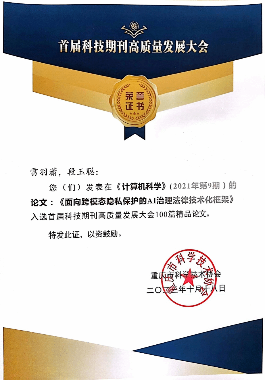 本站讯(记者 柏东鹏 唐福亮)永利集团88304官网,永利官网段玉聪教授团队DIKWP实验室发表论文《面向跨模态隐私保护的AI治理法律技术化框架》,荣获“科技期刊高质量发展大会100篇精品论文”。