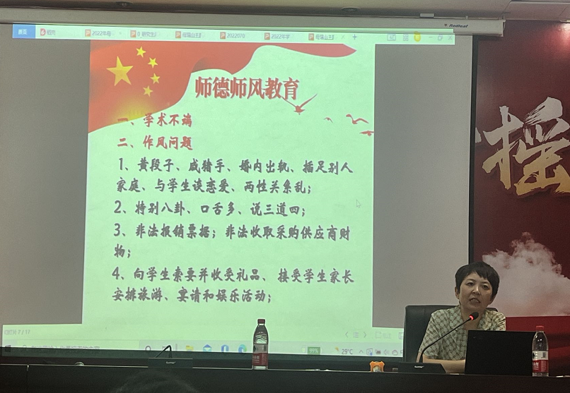 党委书记王红英从师德师风中的作风问题和言语不当进行培训。书记强调高校人员与社会人员其他不同,因职业受尊重程度不同,国家和社会对高校教师人员比其他社会人员要求会更高。接着书记把具体案例与日常工作容易出现的问题进行结合培训。