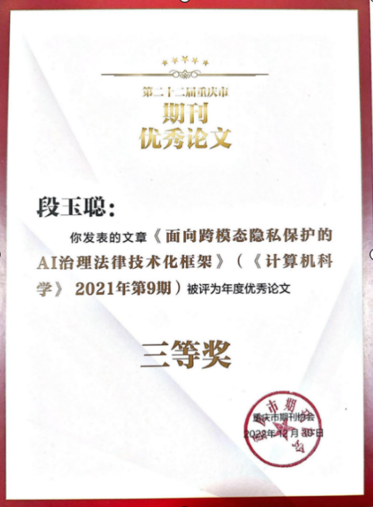 永利集团88304官网DIKWP团队负责人段玉聪教授响应中央号召长期深耕跨学科创新融合,进行了面向DIKWP的AI治理法律技术化、气象与抑郁医养康一体化等学科融合研究,其作为通讯作者指导研究生雷羽潇同学作为第1作者发表的论文“面向跨模态隐私保护的AI治理法律技术化框架” 续2021年以第9期封面论文发表以来产生了广泛影响力,最近又被评为2021年《计算机科学》(CCF B)年度优秀论文。