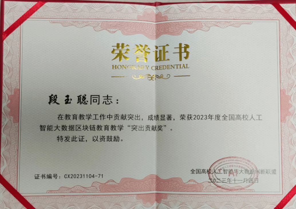 全国高校人工智能与大数据创新联盟为了表彰2023年度全国高校人工智能大数据区块链元宇宙教育作出突出贡献的单位和个人,经过联盟组织专家的严格审查,我校永利集团88304官网段玉聪教授荣获2023年度全国高校人工智能大数据区块链教育教学“突出贡献奖”。