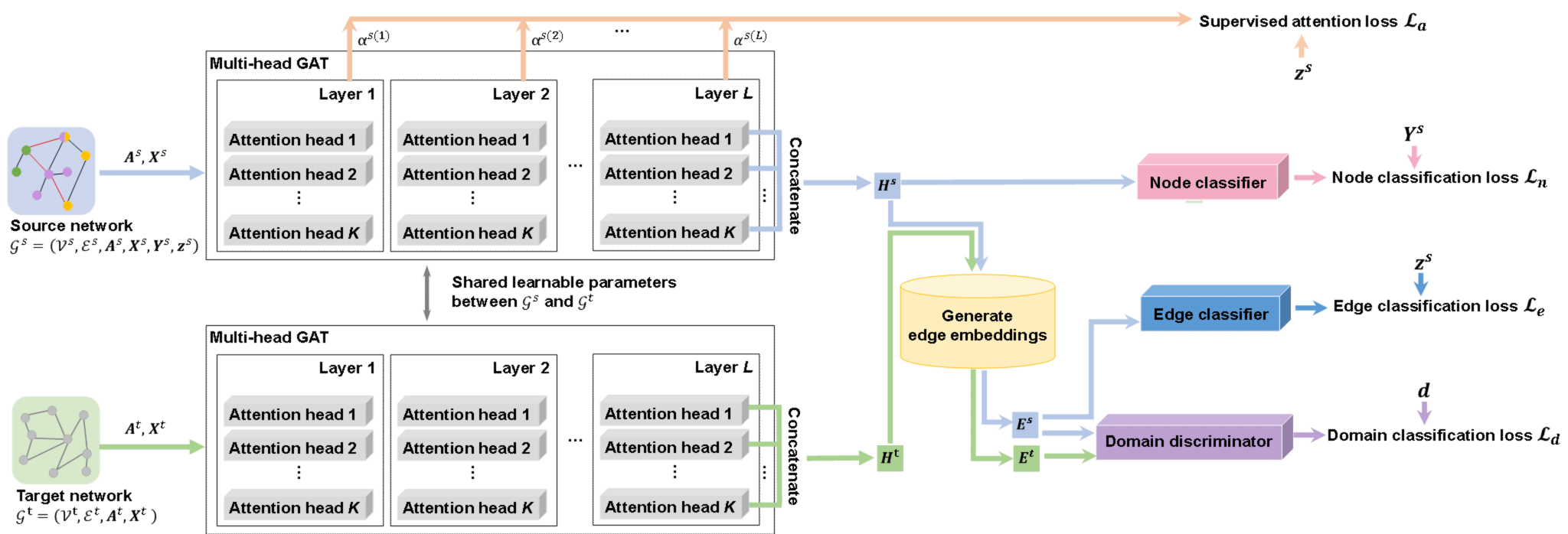 2) 该论文提出首个针对跨网络同嗜边和异嗜边分类的模型,即域自适应的图注意力监督网络(Domain-adaptive Graph Attention-supervised Network, DGASN),模型框架如图2所示。首先,该模型通过联合训练节点嵌入和边嵌入,学习可有效区分同嗜边和异嗜边的嵌入表示;其次,该模型创新地在图注意学习过程中采用直接监督的方式,一方面,减少异嗜边的注意力权重,以降低其在邻居聚合过程产生的负面影响,另一方面,增大同嗜边的注意力权重,以增强其在邻居聚合过程中的正面影响,从而更有效地区分同嗜边和异嗜边;最后;该模型采用对抗域适应技术学习具有网络不变性的边嵌入,以有效迁移源网络的知识为目标网络进行同嗜边和异嗜边分类。
