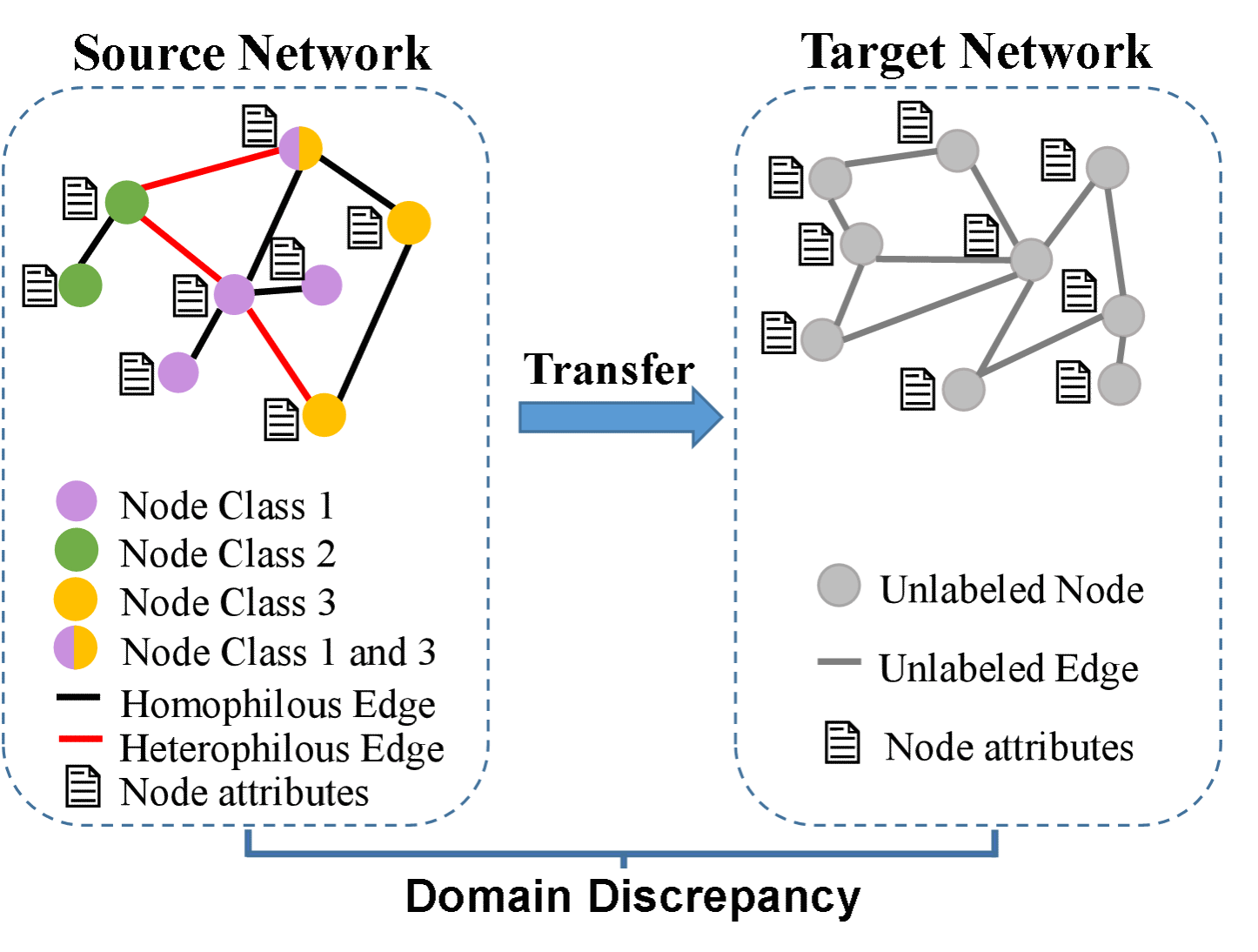 1) 该论文首次定义了跨网络同嗜边和异嗜边分类(Cross-network Homophilous and Heterophilous Edge Classification, CNHHEC)问题。如图1所示,在该问题中,源网络具有已知的节点标签和边标签,其中,同嗜边标签代表边上的两个节点拥有相同的类别,而异嗜边标签代表边上的两个节点属于不同的类别;而目标网络的节点和边均无标签。该问题的目的是迁移由源网络中学习的知识,准确区分目标网络中的同嗜边和异嗜边。