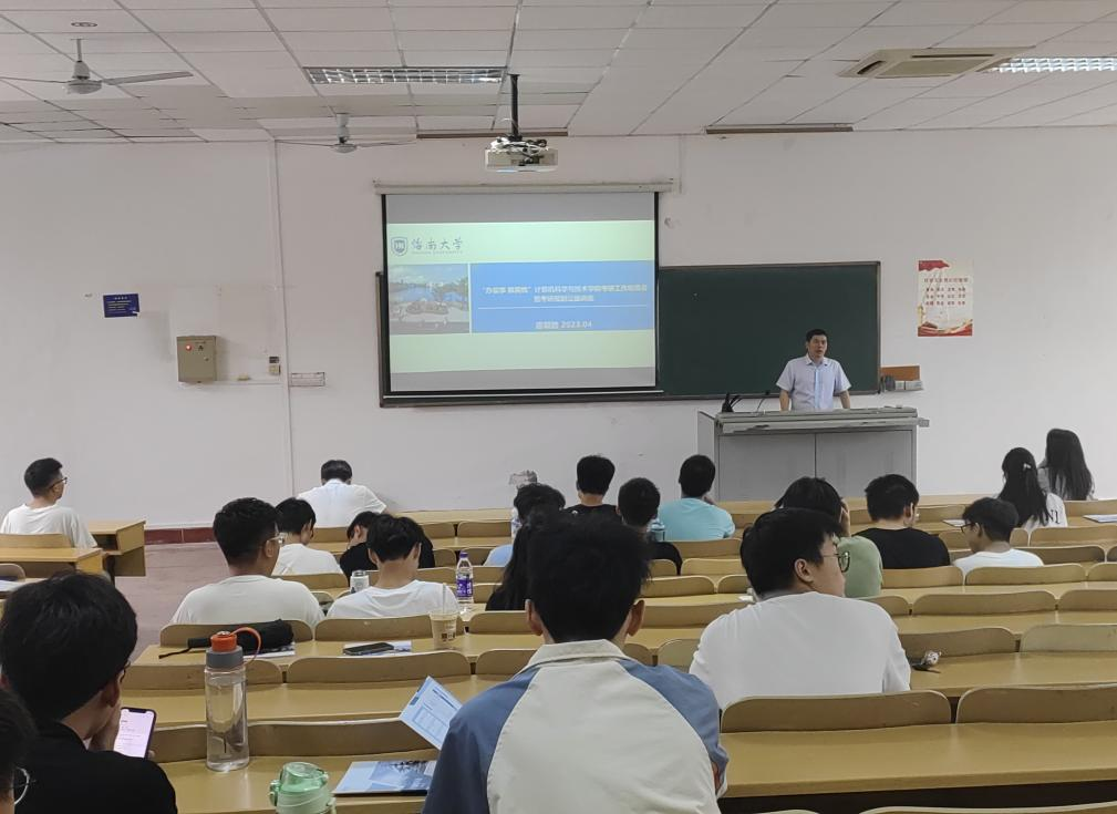 2023年考研学生代表2019级计算机科学与技术专业2班的虞天明同学(中山大学已录取),从考研目标、学校筛选、报考注意事项、考研心理自我强化等各方面进行了讲解;2023年考研学生代表2019级计算机科学与技术专业1班的吴双同学(中南大学已录取)对数学、英语、专业课程的复习方法进行了详细的介绍。