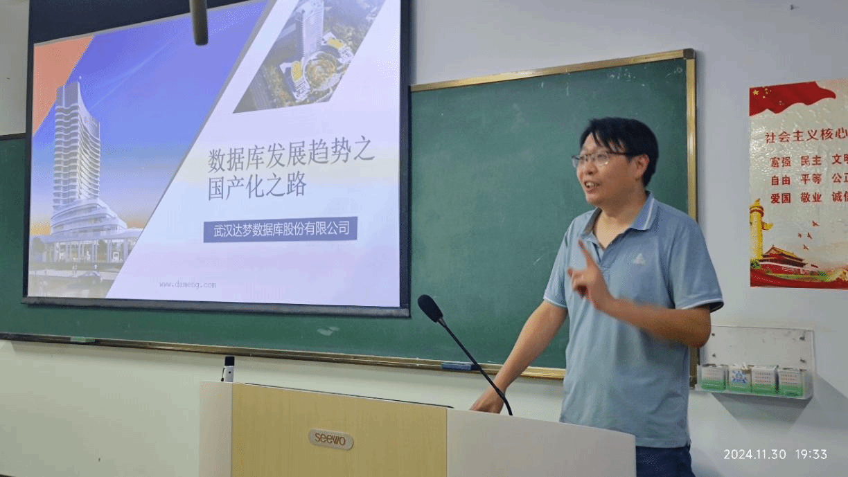为拓宽本科生学术视野,提升数据库系统领域的专业能力,永利集团88304官网,永利官网于2024-2025学年冬季小学期邀请达梦培训中心经理、高级认证讲师张守帅专家,为学生讲授《数据库系统》课程,并举办专题讲座《国产数据库的发展与现状》。