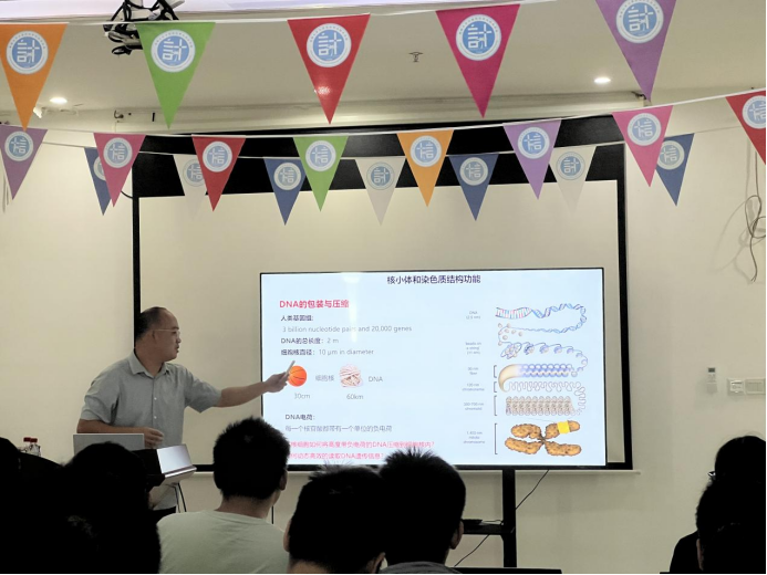 彭云辉副研究员现为华中师范大学物理科学与技术学院硕士生导师,长期致力于生物物理、凝聚态软物质物理及生物信息学等领域的研究工作,发表了40余篇高水平SCI论文,并主持了多项国家自然科学基金等项目。此次报告中,彭老师通过深入浅出的讲解,全面阐述了染色质结构与功能的前沿研究进展。报告围绕染色质结构与功能的计算研究展开,重点介绍了三个研究方向:组蛋白癌突变对核小体结构和功能的影响、核小体与先锋转录因子的相互作用以及染色质中的静电相互作用。他深入解析了癌症突变对核小体结构的破坏性影响及其对基因表达的调控机制,揭示了先锋转录因子通过结合染色质开放区域激活基因表达的过程,并通过计算模拟分析了染色质中静电相互作用对结构稳定性的影响。这些研究为理解癌症发生、基因调控以及染色质结构的动态变化提供了新的视角和理论支持。