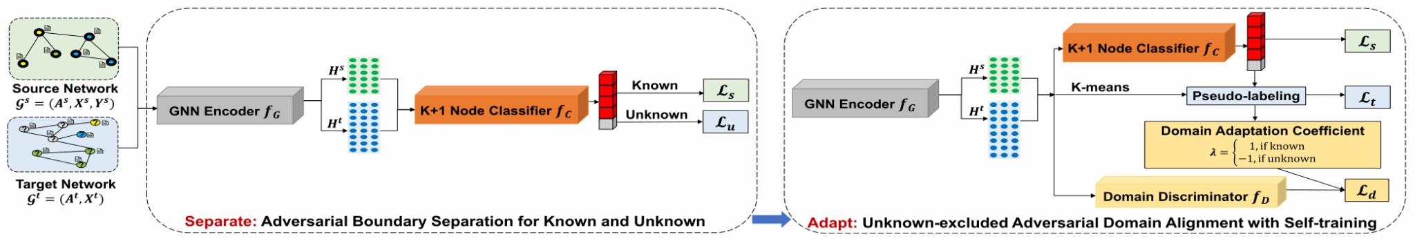 跨网络节点分类(Cross-network Node Classification, CNNC)是近期图机器学习领域的热点研究问题,旨在迁移从标签丰富的源网络中学习的知识,帮助缺乏标签的目标网络预测节点标签。现有的跨网络节点分类方法普遍基于闭集假设,即要求源网络和目标网络共享相同的类别空间。然而,在现实世界的应用场景中,这种闭集假设很难得以保证。为突破闭集假设的限制,该论文研究更为现实和新颖的开放集跨网络节点分类问题,其中,目标网络不仅包含源网络中所有的已知类别,还包含额外的“未知”类别。开放集跨网络节点分类问题的目标是将目标网络中属于源网络已知类别的节点分类到对应的已知类别,并检测出目标网络中属于“未知”类别的节点。