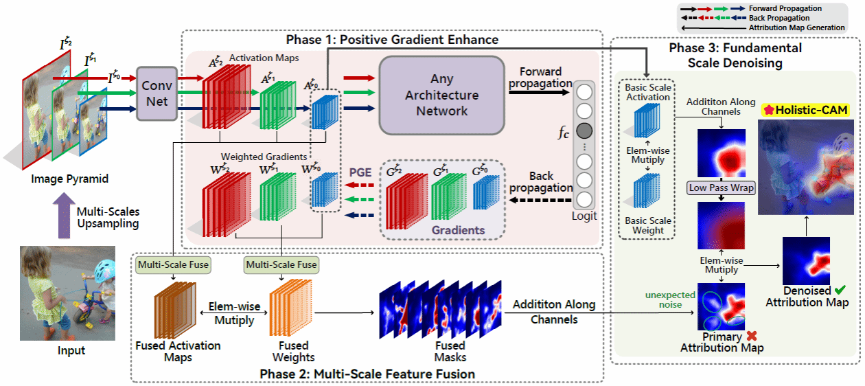 1. 针对卷积神经网络浅层解释可信度差的问题,文章提出一种正梯度增加方法有效提高解释清晰度与健壮性。针对模型整体阶段解释清晰度极低等问题,文章提出了整体类激活映射(Holistic-CAM),将多尺度融合技术与加权正梯度进行有效结合,显著提高了模从浅层到深层整体阶段解释分辨率。