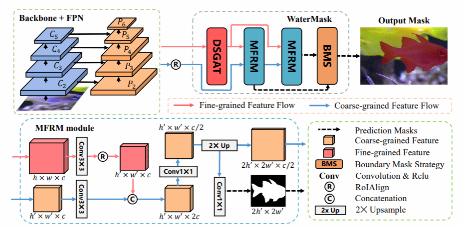 2、 首次提出了针对水下场景的实例分割模型WaterMask。在WaterMask中,设计了差异相似图注意力模块(Difference Similarity Graph Attention Module,DSGAT)和多级特征细化模块(Multi-level Feature Refinement Module,MFRM)来重建和细化水下成像退化的图像特征,并设计了一个针对边界部分的掩码分割策略和边界学习损失函数来优化水下聚类实例的边界。