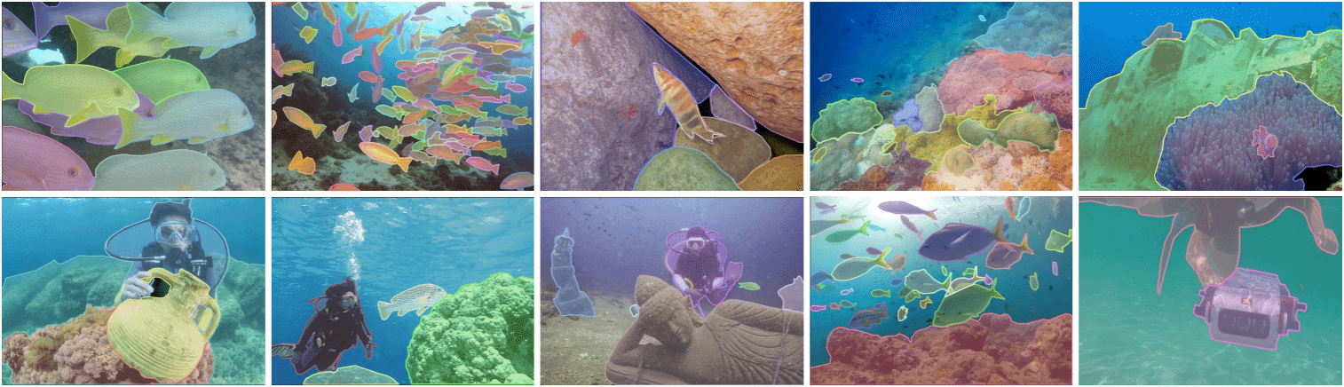 1、 构建了第一个通用水下图像实例分割(UIIS)数据集,该数据集包含涵括鱼类、珊瑚、人类、水下植物、水下机器人等7个类别的4628幅图像,并进行了详细的像素级标注。而现有的其它水下图像实例分割数据集往往针对某一类单一物体,如仅局限于对鱼类的实例分。