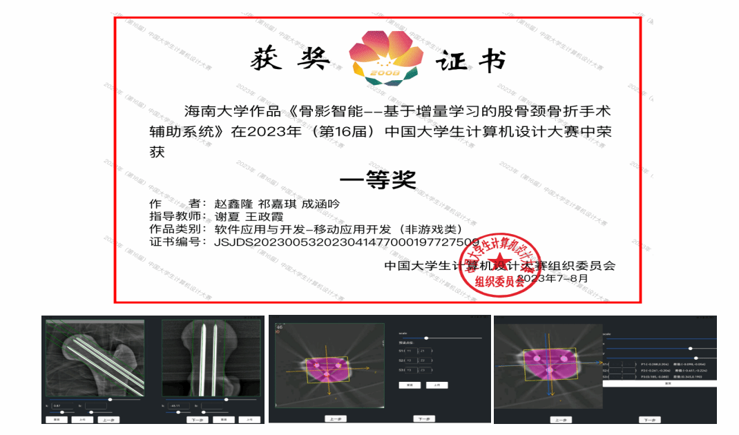 经过激烈角逐,在“软件应用与开发”大类中共产生一等奖42项、二等奖280项、三等奖632项。我院谢夏、王政霞老师指导的学生团队作品“骨影智能--基于增量学习的股骨颈骨折手术辅助系统”荣获国家级一等奖。该作品由赵鑫隆、祁嘉琪、成涵吟三位同学共同完成,是海南大学的学生作品在该赛道获得国家一等奖的零突破。