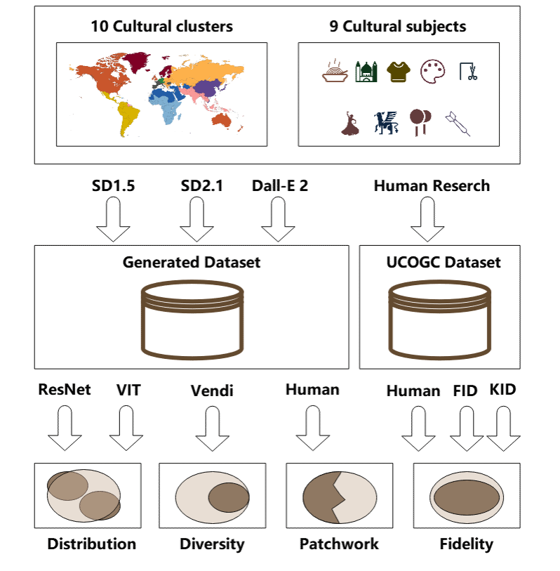 文章聚焦文本到图像 (Text to Image, T2I) 模型生成的图像文化代表性,主要研究T2I模型生成的内容是否能够公平、准确地反映全球文化。文章结合智能和人工方法,从多个维度对DALL-E v2, Stable Diffusion 1.5和2.1等三种流行的T2I模型进行定量研究。该研究做出的主要贡献包括:(1) 首次引入文化集群和文化主题两大属性,为文化代表性的多模态偏差分析提供新的视角和跨学科方法。(2) 通过分析193,700张生成图像和37,600张真实图像,首次全面探索了T2I模型在文化代表性方面的表现,揭示其在分布、多样性、拼凑和保真度方面的偏差。 (3) 构建了Unique Cultural Objects from Global Clusters (UCOGC) 基准数据集,该数据集包含来自30个国家不同文化主题的真实图像,UCOGC还能够支持训练视觉模型以实现文化对象识别。研究指出,T2I模型因其创造潜力而受到广泛关注,但模型会从训练数据中继承偏见,从而导致文化误解。
