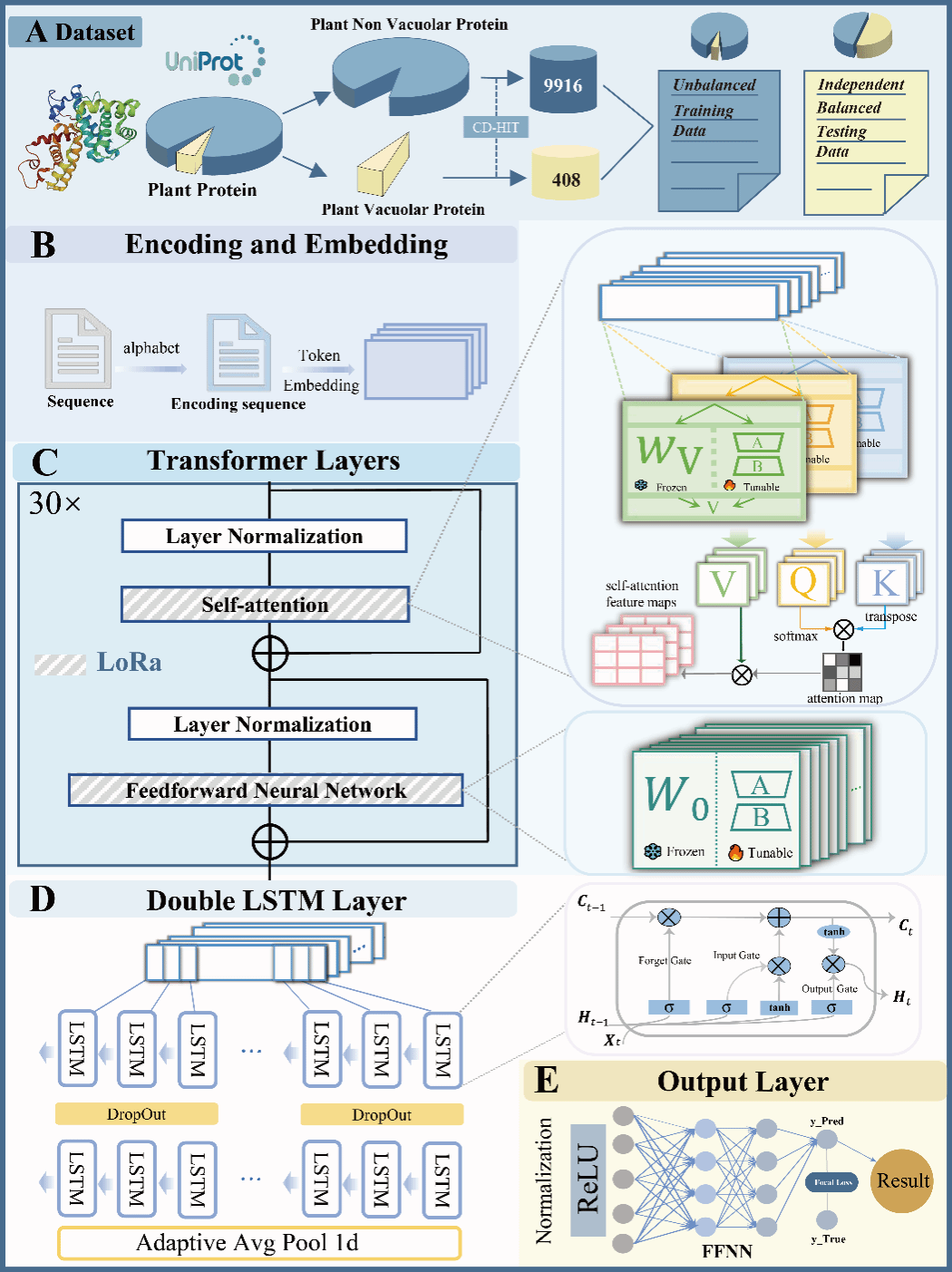 在本研究中,作者首先构建了一个全新的植物液泡蛋白不平衡数据集UB-PVP,在此之上提出了一种新的植物液泡蛋白预测模型PEL-PVP,其利用Transformer结构和self-attention机制计算序列中残基之间的两两联系,捕捉不同位置氨基酸残基之间的相互依赖和作用关系以提取空间特征信息。并且利用双层LSTM独特的记忆单元设计处理远距离依赖,捕捉更复杂的潜在特征。在ESM-2模型的巨量预训练参数之上,对其再进行液泡蛋白的适应性微调,采用LoRa低秩适配技术有效降低了微调过程中的参数量和计算复杂度。模型性能不论在不平衡数据集还是平衡数据集均优于现有的植物液泡蛋白预测器。
