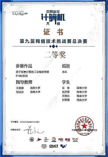 2024年9月7日,第九届“中国高校计算机大赛-网络技术挑战赛”全国总决赛在温州国际云软件谷圆满落幕。我院王晓康教授、刘迎冰副教授指导的学生团队作品《基于张量计算的工业轴承智能PHM系统》经过层层选拔,最终在本次大赛中荣获二等奖。此次成绩充分展现了我院师生团队的专业实力与创新能力,展示了学院在网络技术领域的教学成果和实践应用水平。